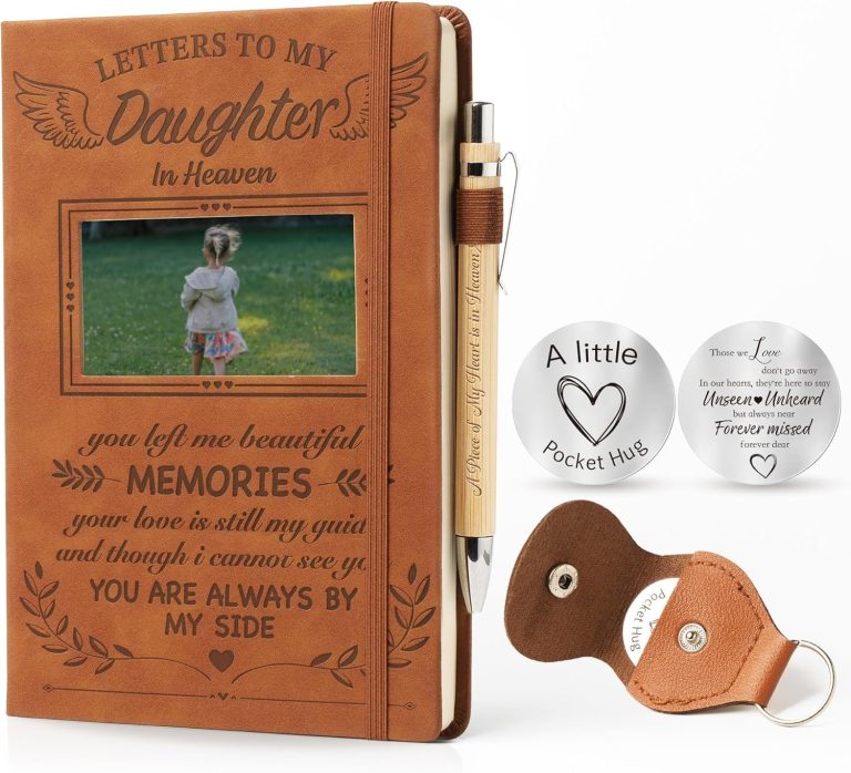 Cuaderno de Cartas a mi Hija en el Cielo. Compañero eterno para la pérdida de una hija: sana a través de recuerdos atemporales. Un abrazo del cielo, escribe tu camino hacia la curación: cuando las palabras fallan, deja que este diario de cuero sintético de lujo sea su voz. Las páginas rayadas guían las letras la hija en el cielo, mientras que el bolígrafo de madera grabado se convierte en una herramienta ritual para liberar el dolor. Trae 3 piezas. Este producto está patrocinado en Amazon. Más info en el enlace.