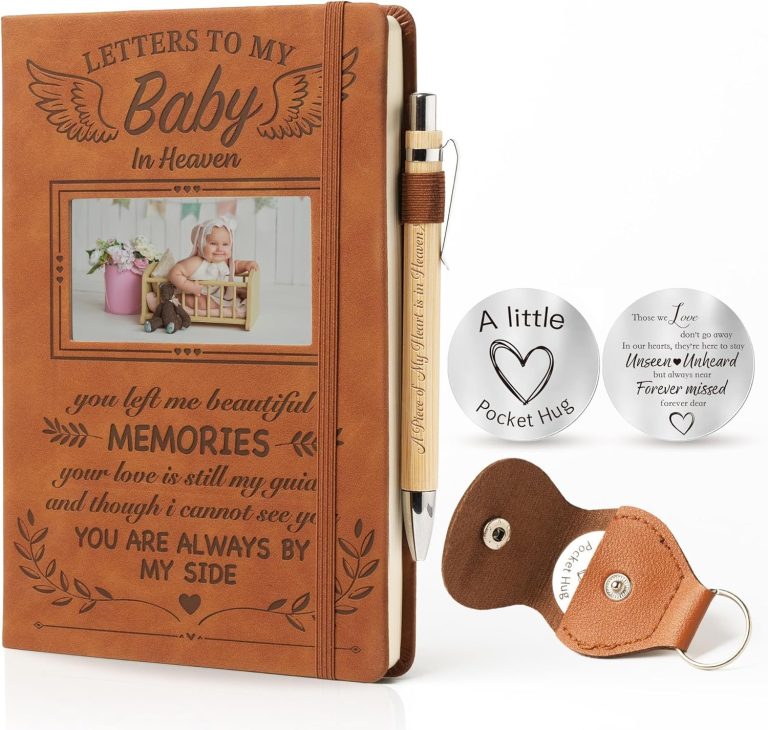 Cuaderno de Cartas a mi Bebé en el Cielo. Compañero eterno para la pérdida del bebé: sana a través de recuerdos atemporales. Un abrazo del cielo, escribe tu camino hacia la curación: cuando las palabras fallan, deja que este diario de cuero sintético de lujo sea su voz. Las páginas rayadas guían las letras al Bebé en el cielo, mientras que el bolígrafo de madera grabado se convierte en una herramienta ritual para liberar el dolor. Trae 3 piezas. Este producto está patrocinado en Amazon. Más info en el enlace.