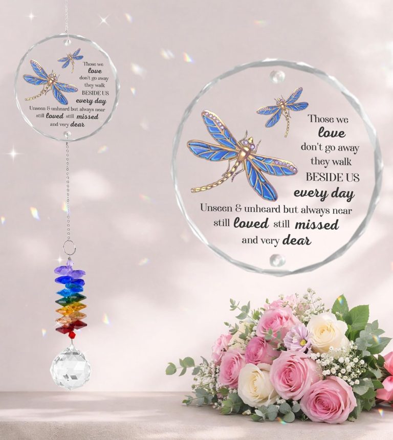 Elaborado con cristal de vidrio de primera calidad, cada atrapasoles captura la luz del sol y la transforma en reflejos radiantes que llenan tu espacio de paz y calidez. Muestra una libélula, símbolo de transformación y resiliencia. Una mezcla perfecta de arte y sentimiento.