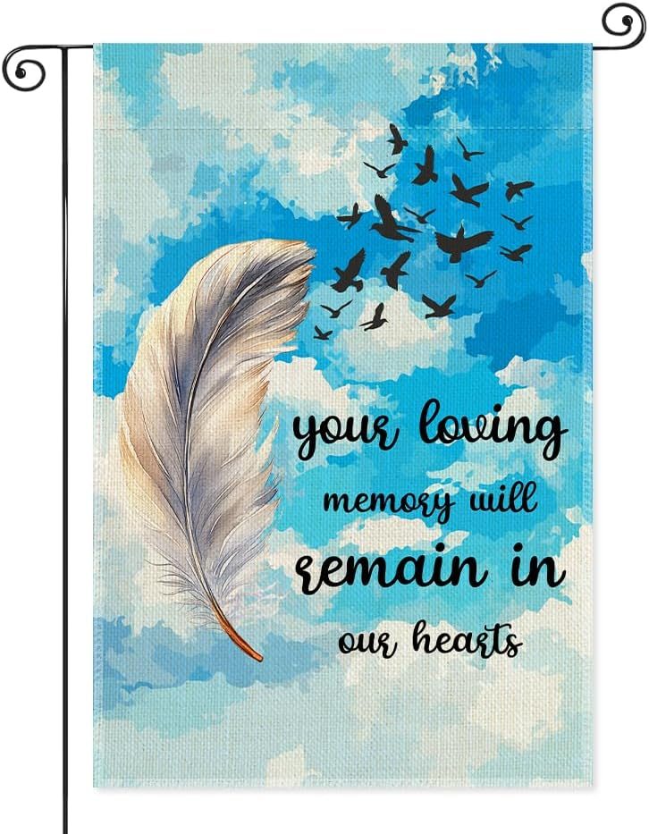 "Tu amada memoria permanece en nuestros corazones" - Recuerdo de Duelo. Bandera de jardín o cementerio. Mide 12 x 18 pulgadas, es ligera y portátil, y se puede montar en la mayoría de los soportes de bandera estándard.