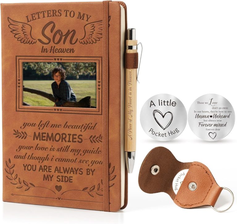 Cuaderno de Cartas a mi Hijo en el Cielo. Un abrazo del cielo, escribe tu camino hacia la curación: cuando las palabras fallan, deja que este diario de cuero sintético de lujo sea su voz. Las páginas rayadas guían las letras al hijo en el cielo, mientras que el bolígrafo de madera grabado se convierte en una herramienta ritual para liberar el dolor. Este producto está patrocinado en Amazon. Más info en el enlace.